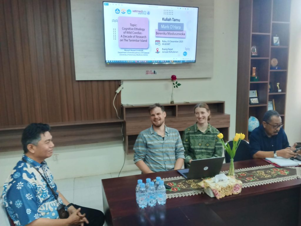 Jurusan Kehutanan menyelenggarakan kuliah tamu bertema “Cognitive Ethology of Wild Corellas – A Decade of Research on the Tanimbar Island” pada Rabu, 3 Desember 2025, menghadirkan Mark O’Hara dan Berenika Mioduszewska dari Messerli Research Institute untuk memaparkan hasil riset 10 tahun mengenai ekologi, kognisi, dan konservasi burung kakatua Tanimbar di Pulau Tanimbar.